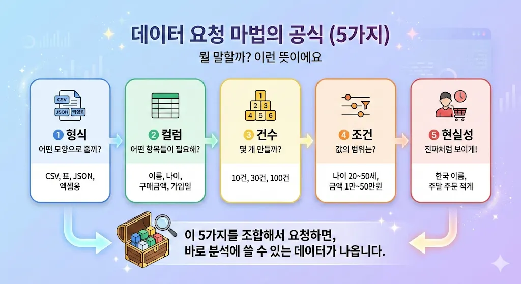 그래서 5가지만 구체적으로 말해주면 원하는 데이터를 정확히 받을 수 있어요.