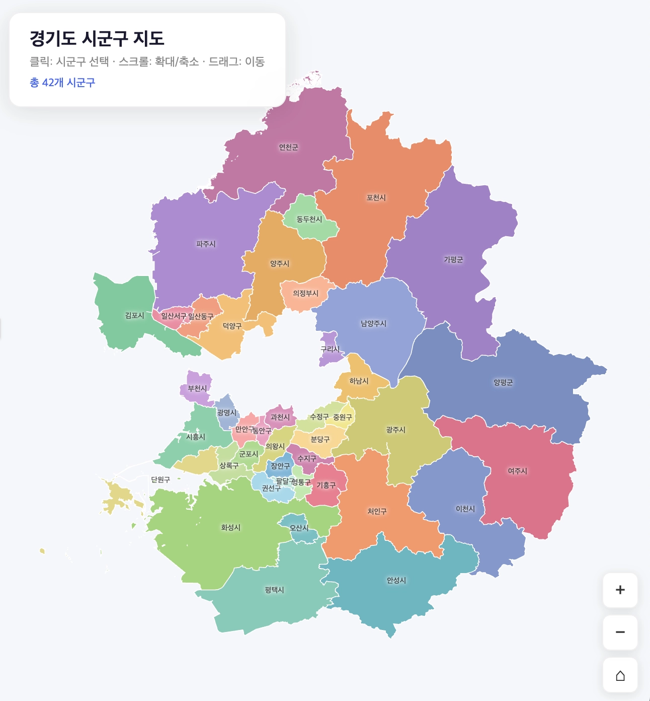 지역 이름, 코드, 면적 등이 팝업으로 뜨는 기본 지도입니다.