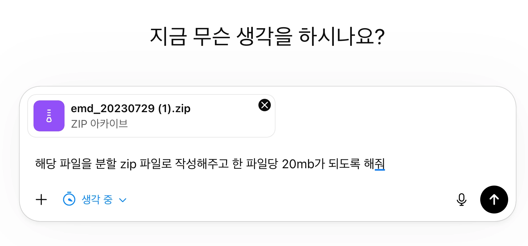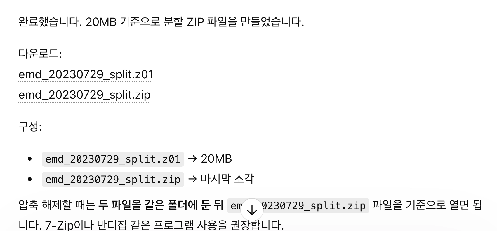 해당 파일을 분할 zip 파일로 작성해주고 한 파일당 20mb가 되도록 해줘. 라고 chatgpt에게 요청하면 분할파일을 만들어줍니다. 제가 chatgpt에게 자주 요청하는 방법이에요.