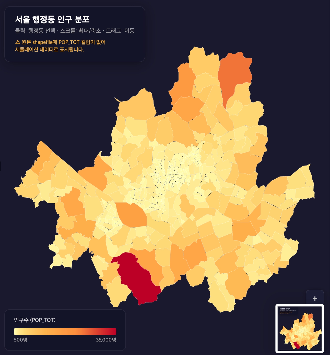 "시뮬레이션 데이터를 작성해주고 인구 많은 곳은 진한 빨강, 적은 곳은 연한 노랑으로 표현해줘."