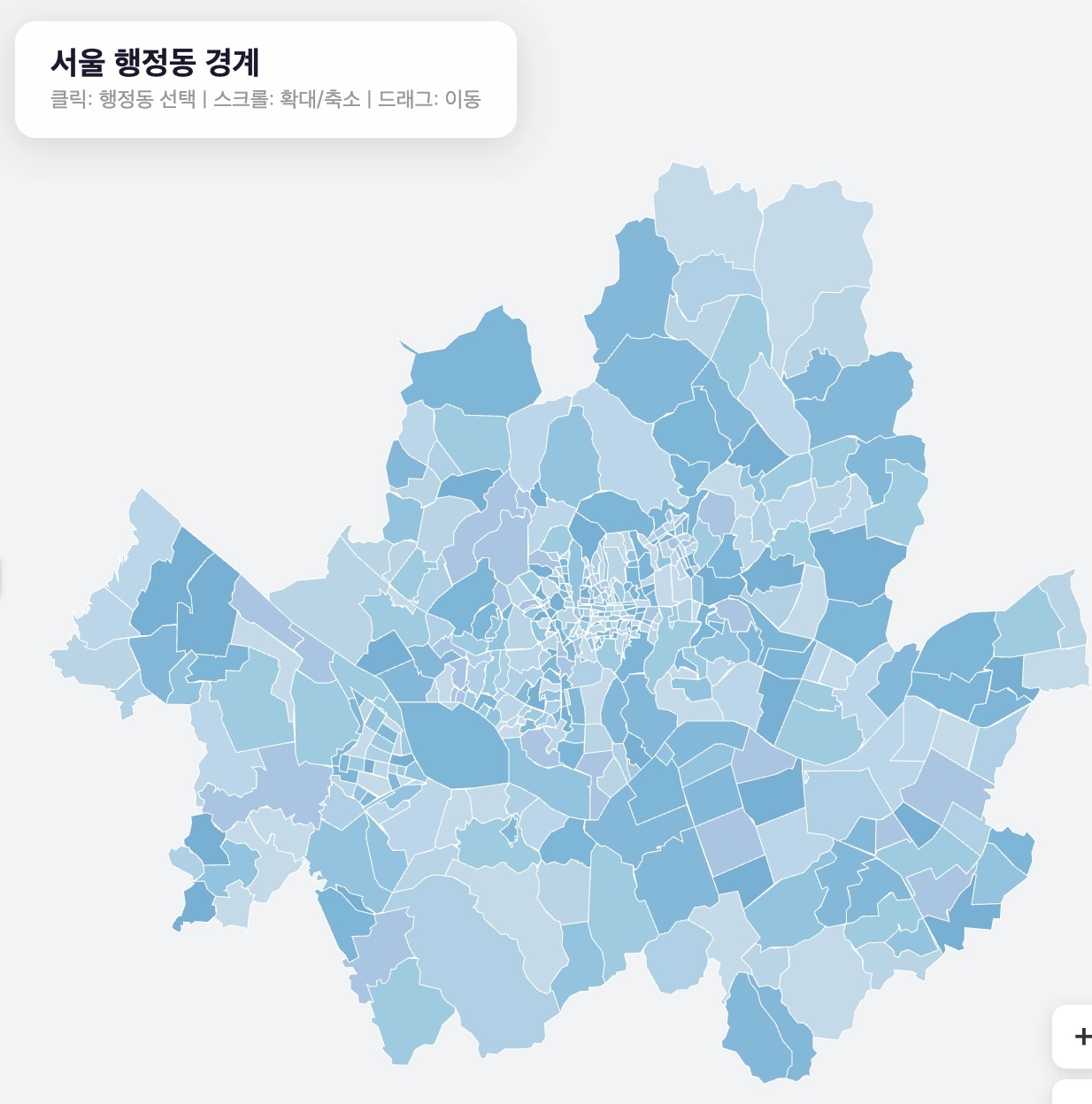 "서울 행정동 경계를 지도로 보여줘. 클릭하면 행정동 이름이 나오게 해줘."