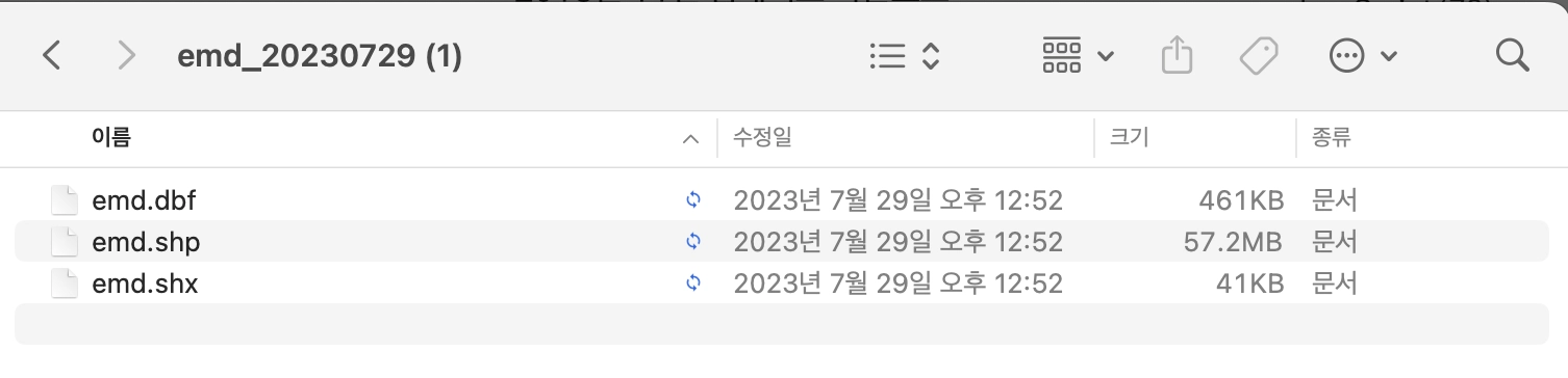사이트에 있는 국가공간정보포털에서 서울 행정구역 파일을 받았습니다. 압축을 풀면 파일이 세 개 나옵니다.